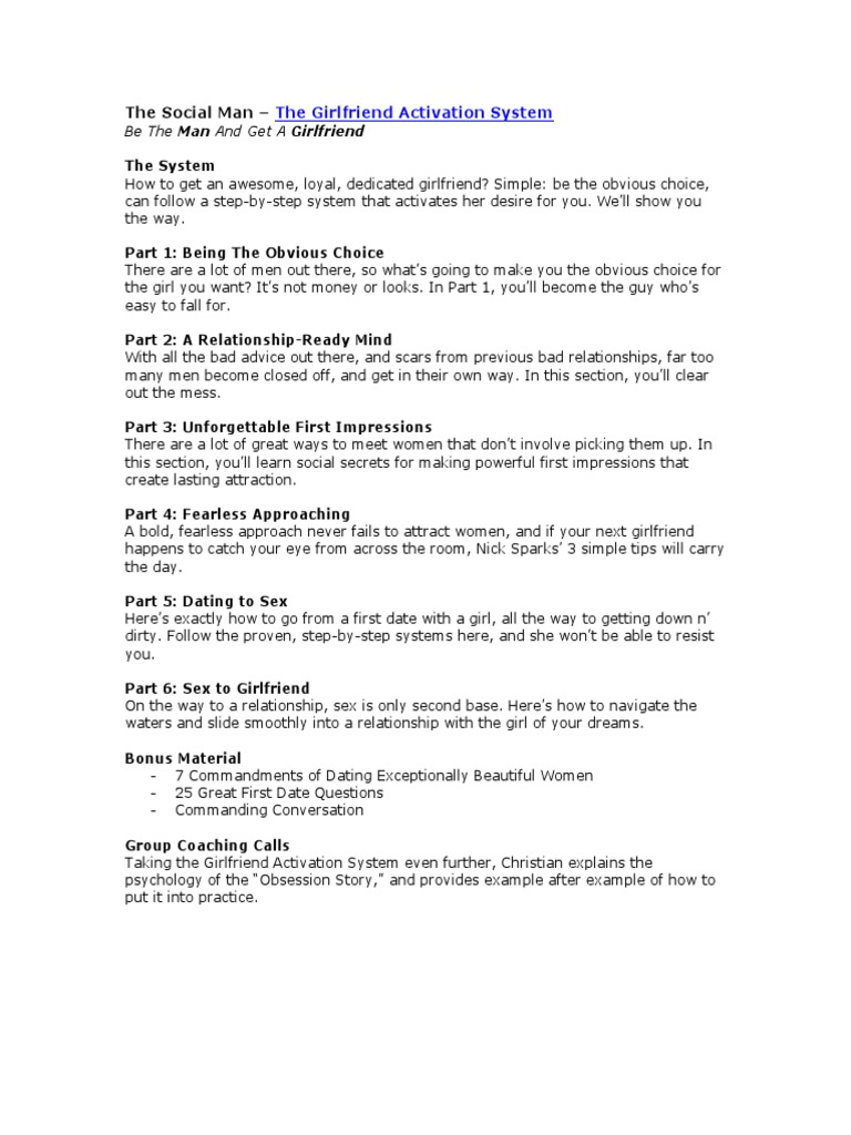 The videos are all centered around one theme. The Girlfriend Activation System GFAS by Christian H. In this honest review Im going to reveal EVERYTHING. It teaches men how to activate a womans emotions and make her feel pure desire. 84 found this document not useful Mark this document as not useful. Click Here to Download the Girlfriend Activation System V2. Httpsbitly30WpC4e -- click here to get the full courseHey all Christian here.
